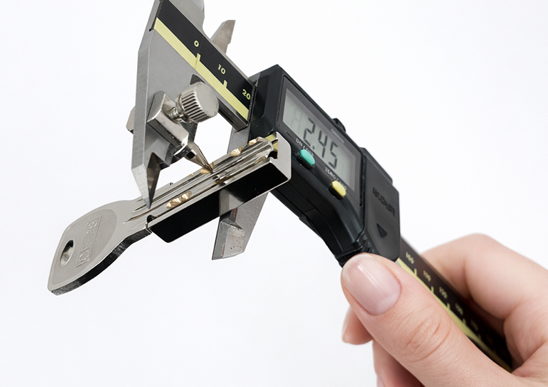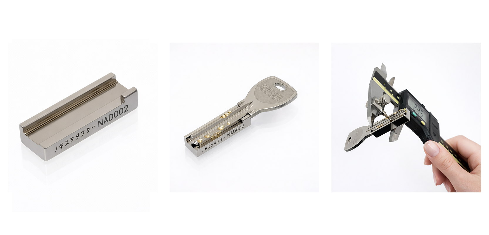 MIWA PS・PR(CF-27・CF-28・CF-32・CF-33)の鍵足は独特な凹凸形状のため、通常のノギスでは寸法測定が困難です。本アダプターを使用することで鍵足を水平に保てるため、ディンプル加工後の寸法を安定した状態で測定できます。高精度が求められるディンプルキー加工をサポートするプロ向けツールです。