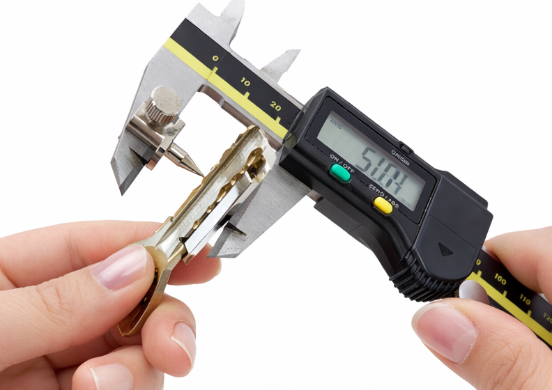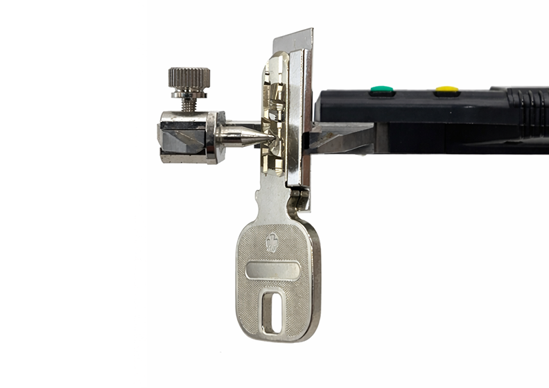 本アダプターを使用することで、鍵足を斜め45°に傾けた状態を安定して保持しながらノギスをあてることが可能となり、ディンプル加工後の寸法を安定した状態で測定できます。高精度が求められるディンプルキー加工をサポートする、プロ向けツールです。
